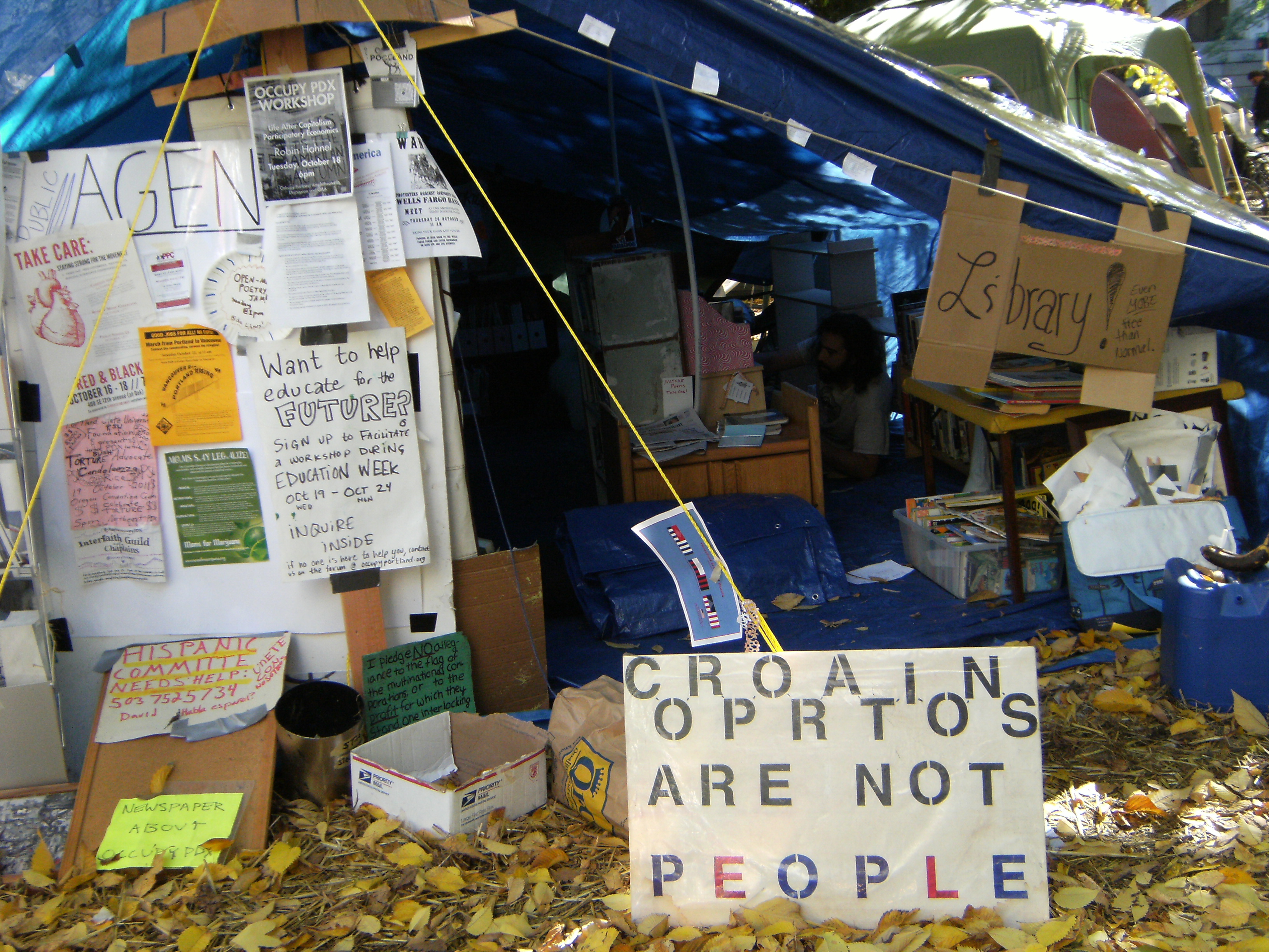 In Portland, Oregon, there are hundreds of people camped out downtown on Main Street, between City Hall and the Department of  Justice in support of Occupy Portland. A  make-shift community has been created that holds people from diverse political backgrounds and all walks of life are represented. It is a community within a community, and from what I can tell, well-organized: there are tent structures and tarps for shelter, a working kitchen, a sanitation area, people are available to communicate with the media and to give information to the public and so on. A utopian community has been created, where people share what they have and use consensus-based decision-making to solve problems.